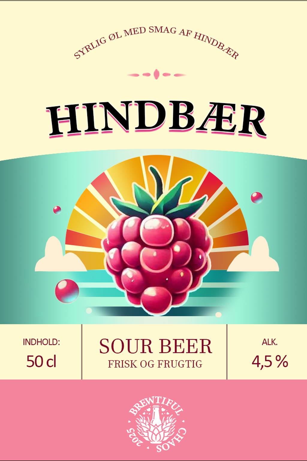Vi har lavet en Sour-øl, hvor der er tilsat et hav af hindbær. Sammen med de nøje udvalgte malte og den meget neutrale humle, giver det et perfekt samspil og vi har derved skabt en lækker syrlig øl med masser af frugtsmag og fint rødligt skum!